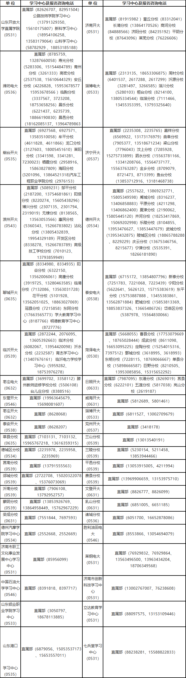 山東開放大學2024年春季開放教育學習中心及報名咨詢電話