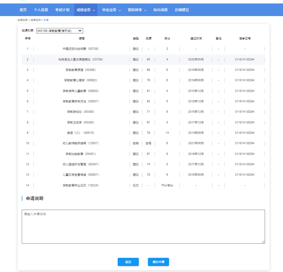 成績證明申請頁面:顯示考生所選擇的專業和該專業所有的合格成績,并填寫申請說明,如下圖所示: