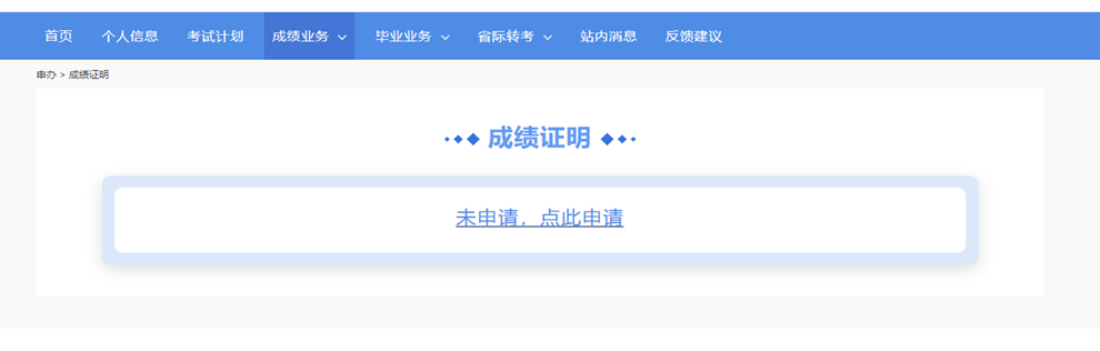 凡參加上海市高等教育自學考試,已取得一門及以上合格成績且未畢業的考生,可以登錄“考生服務平臺”(https://ste.shmeea.edu.cn/login.html),點擊頂部菜單【成績業務】欄下的【成績證明】欄目,點擊頁面中“未申請,點此申請”鏈接(如下圖所示)進入申請成績證明頁面。
