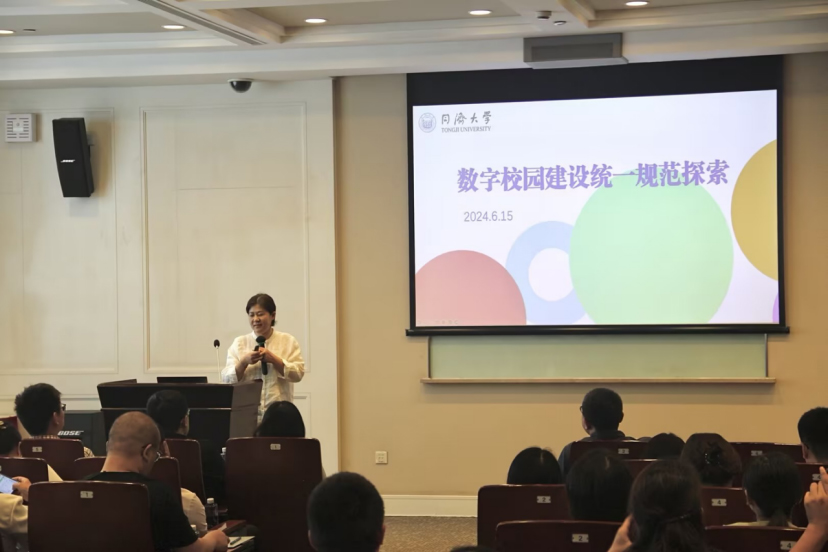 同濟大學信息化辦公室副主任馮昕分享了關于數字校園建設統一規范探索的經驗與思考。在同濟大學《人工智能賦能學科創新發展行動計劃(2024-2027)》引領下,同濟大學智慧校園建設立足師生實際需求,自上而下相互協同,以統一建設規范、統一技術底座、統一身份管理、統一數據共享、統一用戶體驗,五個“統一”做好數字校園規范建設。她指出,“數字服務品質的提升,沒有最好,只有更好。”在建設數字高校的過程中,要進行宏觀到微觀的全局掌控,不斷提升數字人才的綜合能力,業務與技術雙料并重,才能真正觸達用戶。