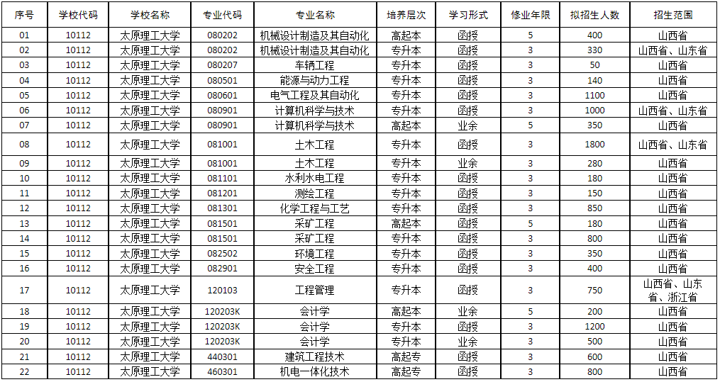 太原理工大學繼續教育學院2022年成人高等教育計劃一覽表
