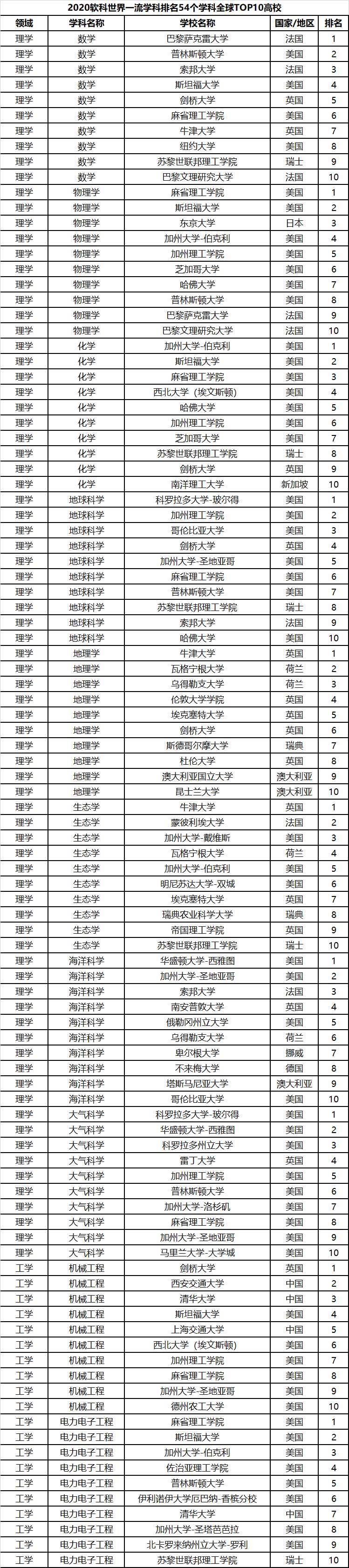2020軟科世界一流學科排名中,中國內地高校表現強勁,在10個學科奪得世界第一,分別是清華大學(通信工程)、哈爾濱工業大學(儀器科學)、同濟大學(土木工程)、上海交通大學(船舶與海洋工程)、武漢大學(遙感技術)、北京科技大學(冶金工程)、北京航空航天大學(航空航天工程)、北京交通大學(交通運輸工程)、江南大學(食品科學與工程)和中南大學(礦業工程)。