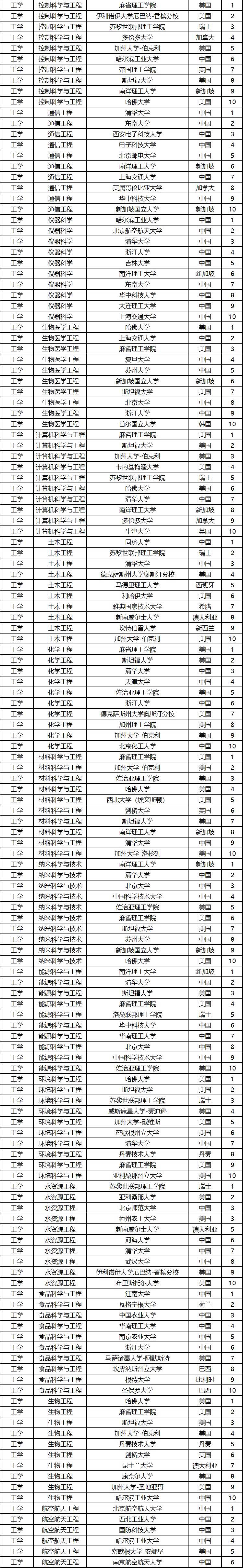 中國內地高校在工學領域表現強勢,在18個工學學科的世界五十強中,中國內地高校的數量超過10所,分別是儀器科學(25所)、化學工程(21所)、交通運輸工程(21所)、礦業工程(21所)、納米科學與技術(20所)、通信工程(19所)、能源科學與工程(17所)、材料科學與工程(16所),船舶與海洋工程(16所)、生物醫學工程(14所)、遙感技術(14所)、機械工程(13所)、冶金工程(13所)、計算機科學與工程(12所)、控制科學與工程(11所)、食品科學與工程(11所)、土木工程(10所)和航空航天工程(10所)。