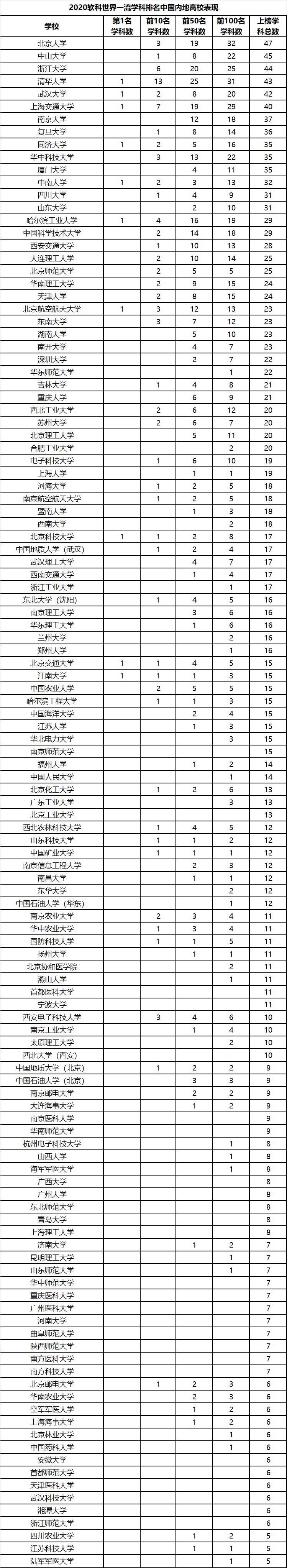 從中國內地高校的上榜學科數量來看,北京大學最多,共計47個學科上榜。中山大學、浙江大學、清華大學和武漢大學分別以45次、44次、43次和42次上榜數分列前五。此外,北京大學有32個學科位列世界百強,也是中國內地高校中百強學科數量最多的高校。值得一提的是,清華大學有13個學科躋身世界前十,是中國內地高校中前十名學科最多的高校,上海交通大學和浙江大學也分別有7個和6個學科位列世界前十。