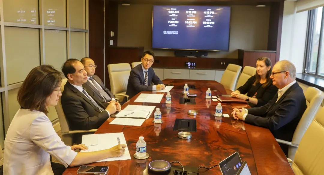 訪問芝加哥大學期間,芝加哥大學校長保羅·阿利維薩托斯(Paul Alivisatos)會見代表團一行。龔旗煌感謝芝加哥大學對2024年中美頂尖大學“10+10”校長論壇給予的鼎力支持,并回顧了兩校在教學科研、人才培養等領域的密切合作。龔旗煌表示,芝加哥大學北京中心及北京大學芝加哥中心在促進兩校深度合作方面具有標志性意義,希望未來兩校在學生聯合培養、科學研究等領域開展更加廣泛的合作。阿利維薩托斯歡迎龔旗煌一行訪問芝加哥大學,并介紹了芝加哥大學海外中心在人才培養領域發揮的重要作用。他希望在已有合作基礎上,進一步深化兩校合作。