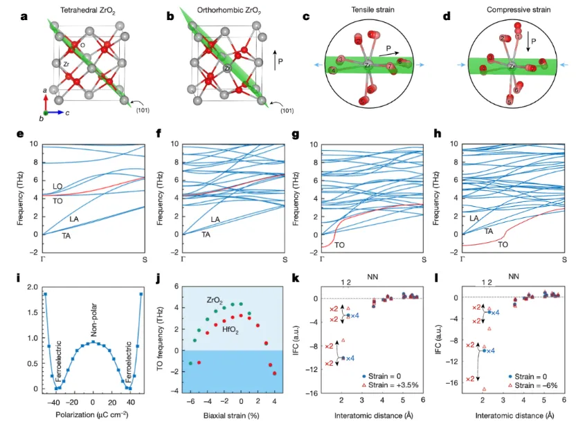 氧化物高k介電常數和鐵電相變一個重要因素是光學聲子軟化。通常認為,光學聲子軟化來自強Born有效電荷引起的長程庫倫相互作用和弱的原子化學鍵,極化效應導致材料的介電常數與帶隙通常成反比,難以同時擁有高介電常數和大帶隙。此外,鐵電材料受限于強Born有效電荷引起的界面退極化效應,使其難以應用于大規模集成的納米尺度器件。