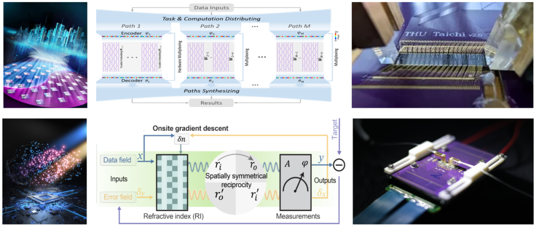 針對人工智能算力與能效的雙重桎梏,首創了分布式廣度光計算架構,研制了國際首款大規模通用智能光計算芯片“太極-I”,實現160 TOPS/W的系統級能效,發表于《科學》。針對大規模神經網絡訓練難題,提出了全前向智能光計算訓練架構,研制了通用光訓練芯片“太極-II”,支撐智能系統的高效精準光訓練,發表于《自然》。太極-I和-II分別實現了大規模智能光計算推理與訓練,構成了智能計算的完整生命周期,將合力為AI大模型、智能無人系統等注入算力發展的“光”動力。