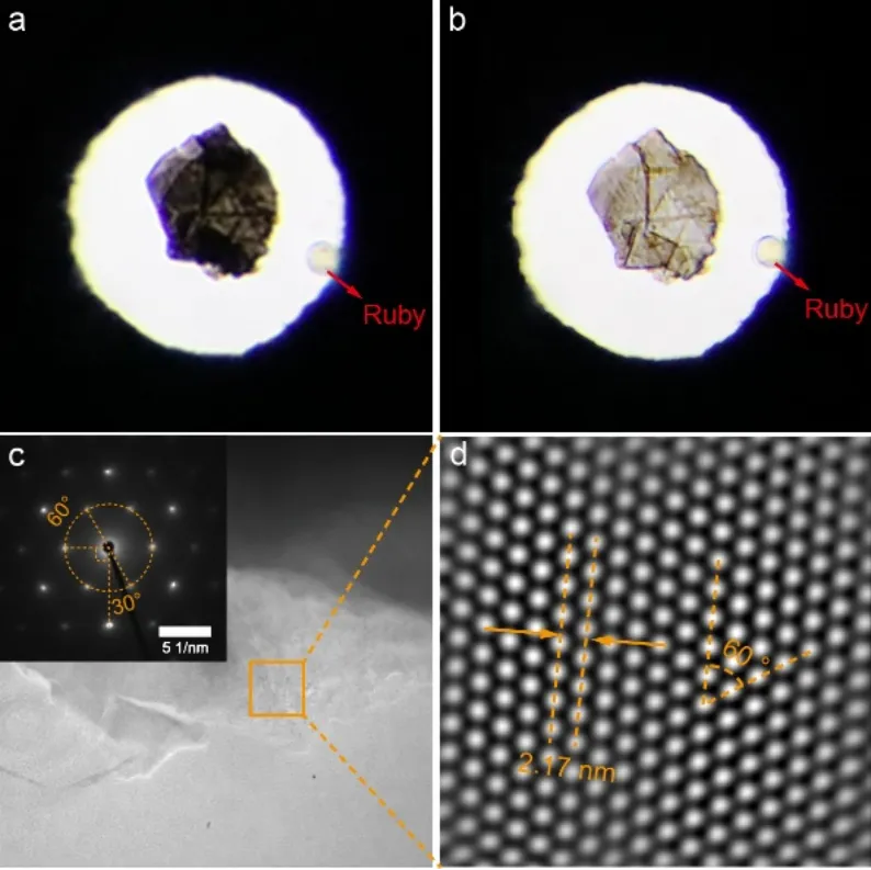 圖1. 超高壓高溫下獲得的純相六方金剛石光學照片與透射電鏡照片