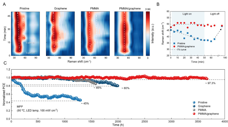 得益于石墨烯出色的機械性能和聚合物的耦合效應,鈣鈦礦薄膜的模量和硬度提高了兩倍,并顯著限制了在光照條件下的晶格動態伸縮效應。研究表明,石墨烯-聚合物雙層結構將晶格變形率從+0.31%降低至+0.08%,有效減少了晶界附近由膨脹引起的材料破壞。