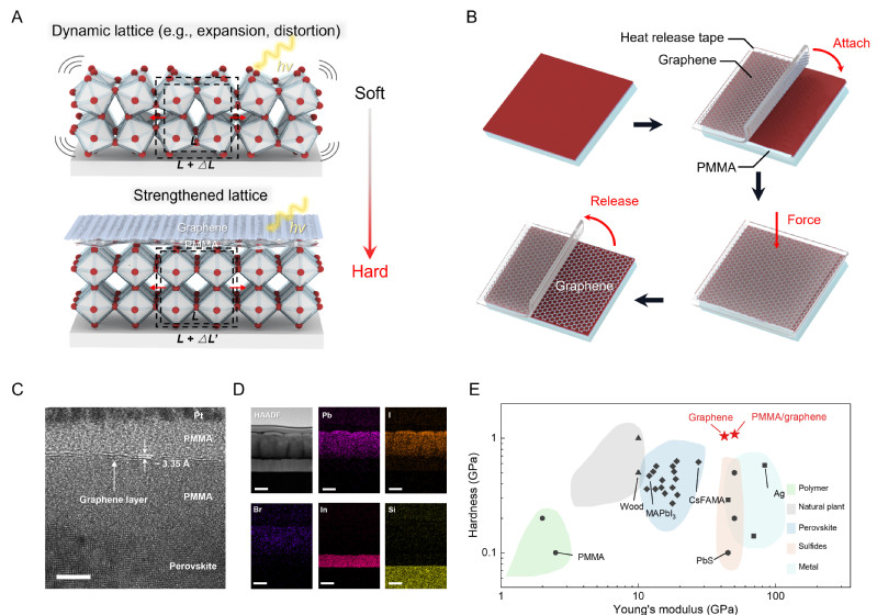 石墨烯具有超高模量(約1 TPa),是鈣鈦礦材料模量的50~100倍,且具有均勻致密、耐機械疲勞和化學穩定的優點。有沒有可能借用石墨烯這個“外援”,來提升鈣鈦礦的穩定性呢?然而,石墨烯與鈣鈦礦并不兼容,如何實現是一大難題。