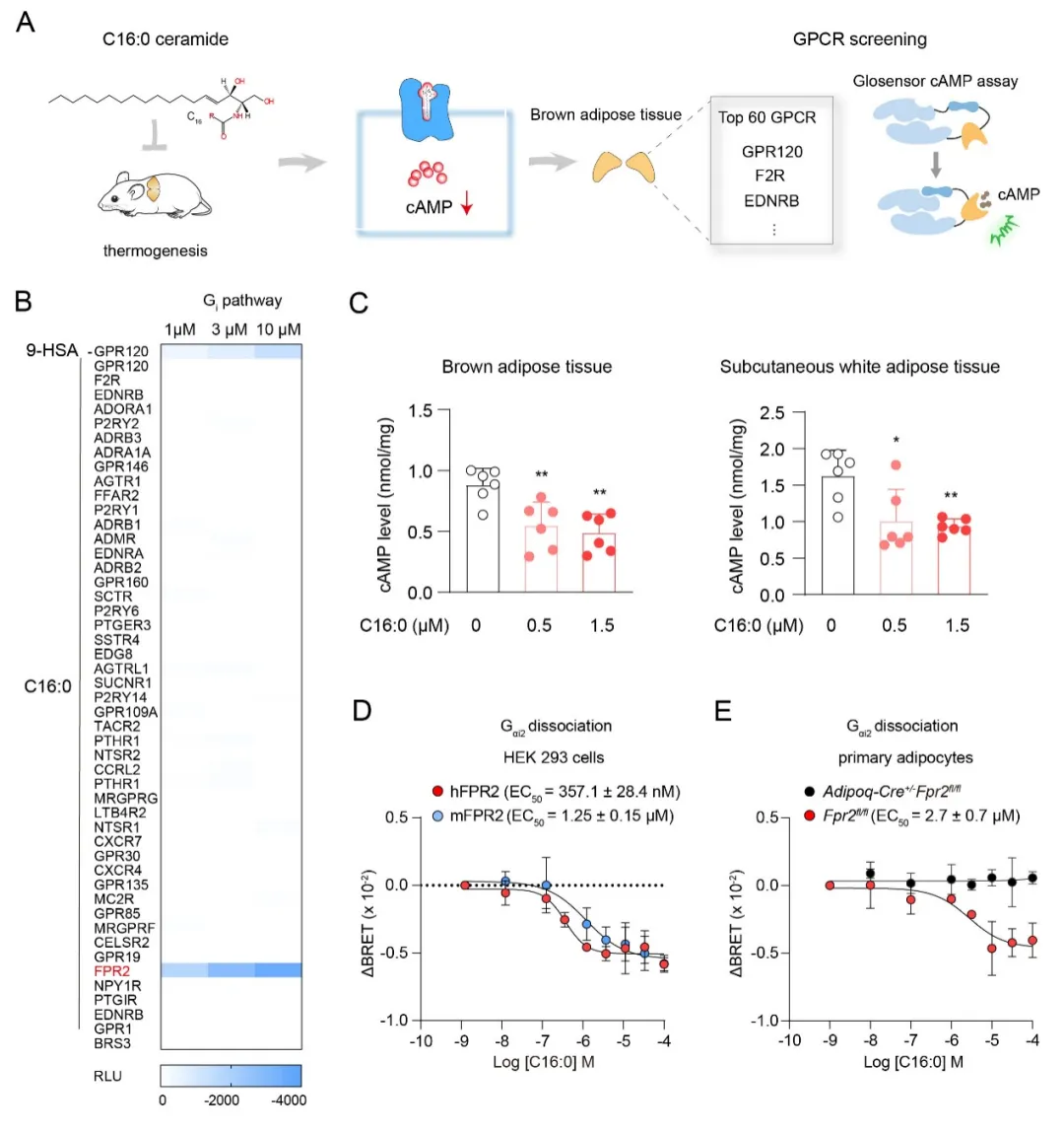 神經酰胺作為鞘磷脂代謝核心分子,其異常累積與糖尿病、肥胖及動脈粥樣硬化等代謝疾病密切相關。研究團隊發現神經酰胺可能通過一種Gi偶聯的GPCR調控脂肪產熱,利用GPCR高靈敏多通路信號檢測系統,鑒定出FPR2是脂肪細胞中Gi偶聯的神經酰胺受體。通過基因敲除和拮抗劑實驗證實C16:0神經酰胺通過激活FPR2受體抑制脂肪產熱。