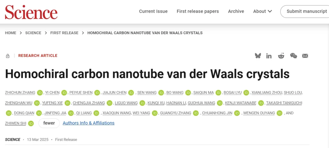 近日,上海交通大學物理與天文學院史志文教授、梁齊教授與合作者在《Science》上發表題為“Homochiral carbon nanotube van der Waals crystals”的研究論文,論文以First Release的形式在Science網站提前在線發表。該研究開發了一種制備碳納米管陣列的全新方法,成功實現了單一手性平行密排碳納米管陣列的直接生長,首次得到了碳納米管范德華晶體結構,并演示了所制備的碳納米管陣列可用于制造高性能場效應晶體管器件。