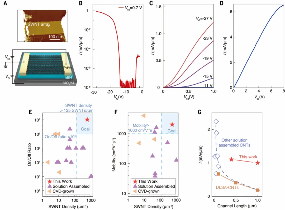 得益于碳納米管陣列單一手性和平行密排的結構特征,基于碳納米管陣列制造的場效應晶體管展現出了優異的電學性能,載流子遷移率接近2,000 cm2V–1s–1,電流承載能力大于6.5mA/μm,開關比可達107,這些器件指標不僅超越以往報道的結果,也優于硅基電路發展路線圖中對未來數年的預期指標。特別地,開態電流承載能力大幅超越了相同加工精度下通過其它方法制備的碳納米管陣列晶體管。這些出色的器件性能展現出所制備的單一手性密排碳納米管陣列在未來高性能碳基納米電子芯片應用中的巨大潛力。