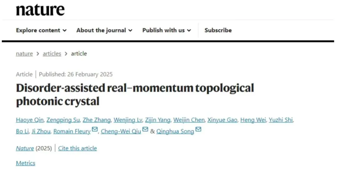 相關研究成果以“無序輔助的實動量拓撲光子晶體”為題在線發表于《自然》(Nature)雜志。宋清華、仇成偉、羅曼·弗勒里為論文通訊作者,深圳國際研究生院科研助理秦昊燁(現為洛桑聯邦理工大學博士生)為論文第一作者,深圳國際研究生院2022級博士生蘇增平和洛桑聯邦理工大學博士后張哲為論文共同第一作者。