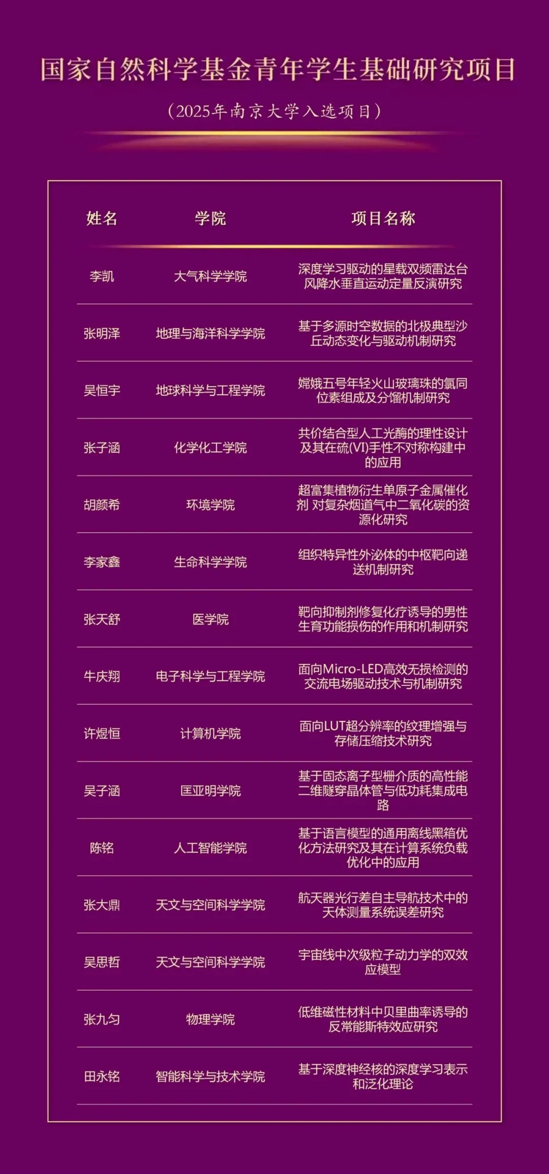 近日,國家自然科學基金委員會發布了2025年國家自然科學基金青年學生基礎研究項目(本科生)評審結果。經過層層選拔,南京大學15名本科生獲得項目資助,選題均直面基礎科學艱深問題、科研攻關瓶頸難題、未來技術發展命題,展現了南京大學豐碩的育人成果,以及南大學子投身基礎研究、矢志科研報國的青春風采。