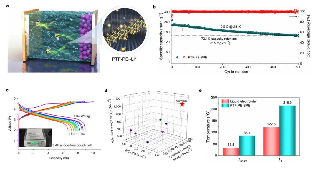 基于含氟聚醚電解質的全電池(a)綜合性能卓越:0.5 C循環500次容量保持率72.1%(b);8.96 Ah軟包電池能量密度達604 Wh kg?1(c),且顯著優于其他體系(d)。熱失控起始溫度高,順利通過針刺與熱箱測試