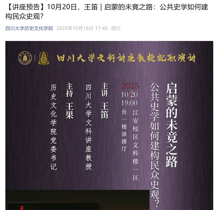 10月18日,“四川大學歷史文化學院”微信公眾號發布講座預告:《10月20日,王笛 | 啟蒙的未竟之路:公共史學如何建構民眾史觀?》。