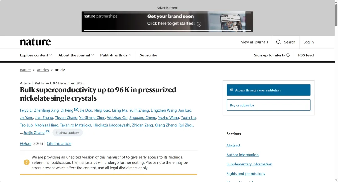 近日,山東大學晶體材料全國重點實驗室張俊杰教授/陶緒堂教授團隊牽頭,聯合北京高壓研究中心曾橋石研究員、中國科學院物理研究所周睿研究員、國家納米科學中心鄭強研究員、芝加哥大學陳愈生教授等多個團隊,在鎳基高溫超導體研究中取得重大突破,相關團隊以“Bulk superconductivity up to 96 K in pressurized nickelate single crystals”為題,在線發表于國際頂級期刊《自然》(Nature)上。