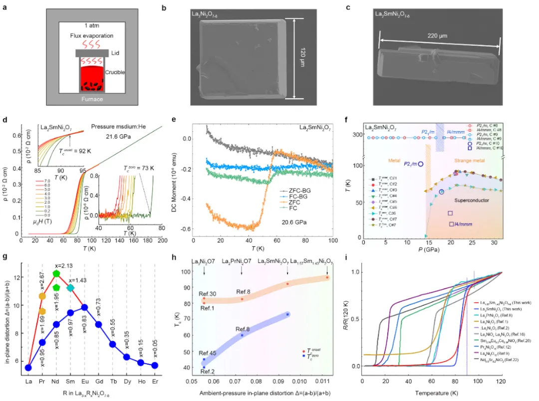 團隊發現La2SmNi2O7單晶在21.6GPa下Tc高達92K,零電阻溫度73K,超導體積分數超60%,明確證實該材料為體超導,同時打破了之前的鎳基超導溫度紀錄。團隊還發現該材料在單斜、四方兩種結構下均能超導,為解決鎳基高溫超導機理問題提供重要結構基礎。