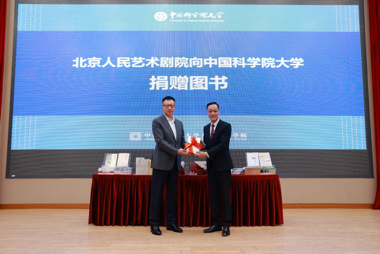 現場,馮遠征代表北京人民藝術劇院向國科大捐贈圖書,書籍涵蓋經典劇本集及舞臺藝術、畫冊、藝術理論專著等多個品類。周琪代表國科大向北京人民藝術劇院頒發捐贈證書。