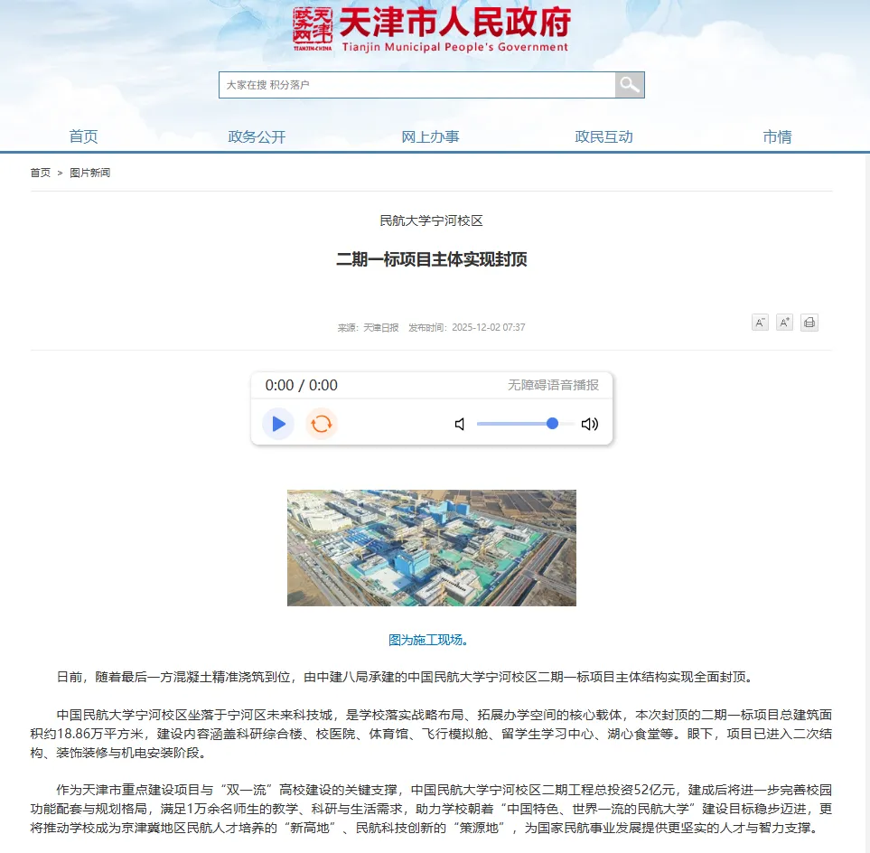 近期,據天津人民政府官網消息,中國民航大學寧河校區二期一標項目主體結構實現全面封頂。該工程總投資52億元,總建筑面積約18.86萬平方米。