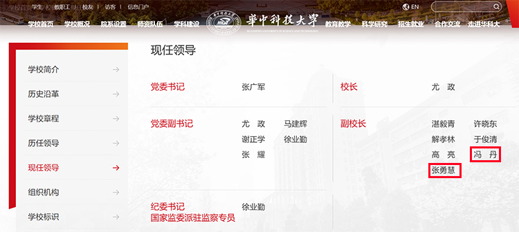 7月5日,華中科技大學官網“現任領導”一欄更新,馮丹、張勇慧已任學校副校長。