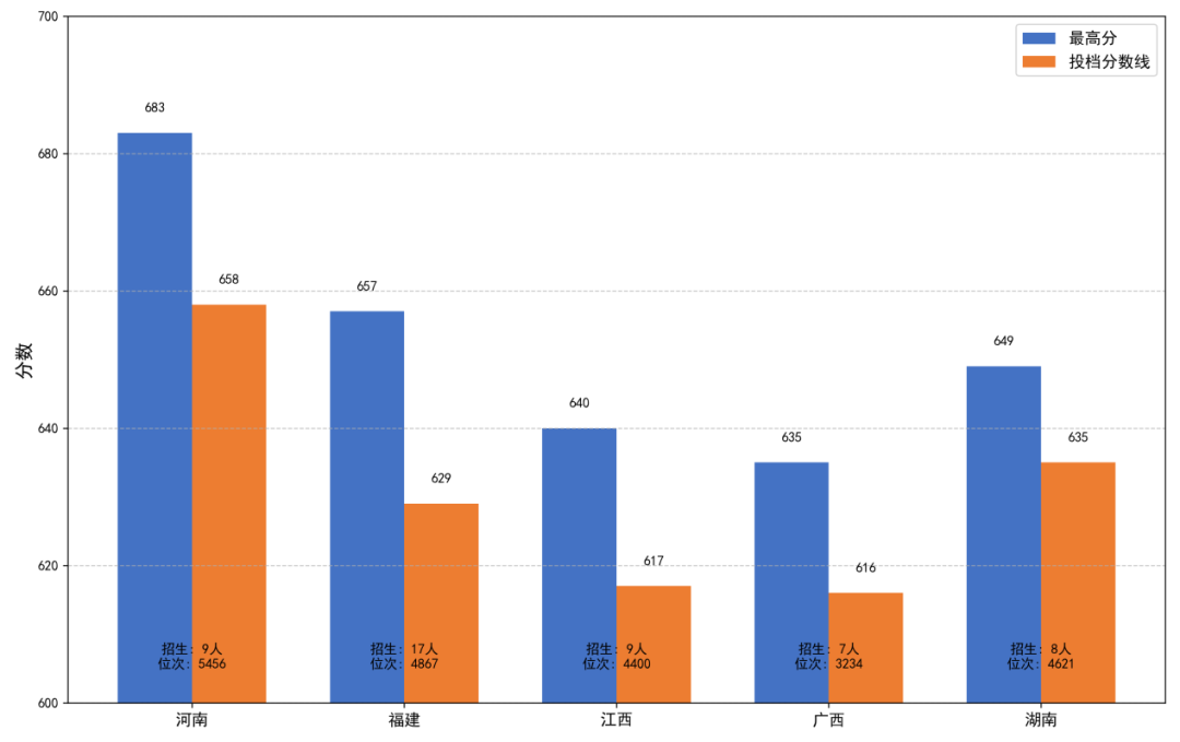 在河南省錄取的最高分達683分,位次857,最低投檔線658分,位次5456;福建省最高分657分,位次1107,最低投檔線629分,位次4867;湖南省最高分649分,位次2299,最低投檔線635分,位次4621。在廣西壯族自治區物理類最低投檔線616分,位次3234,超越北京師范大學、華南理工大學、廈門大學等多所名校;江西省物理類最低投檔線617分,位次4400,高于哈爾濱工業大學、山東大學、湖南大學等985名校。