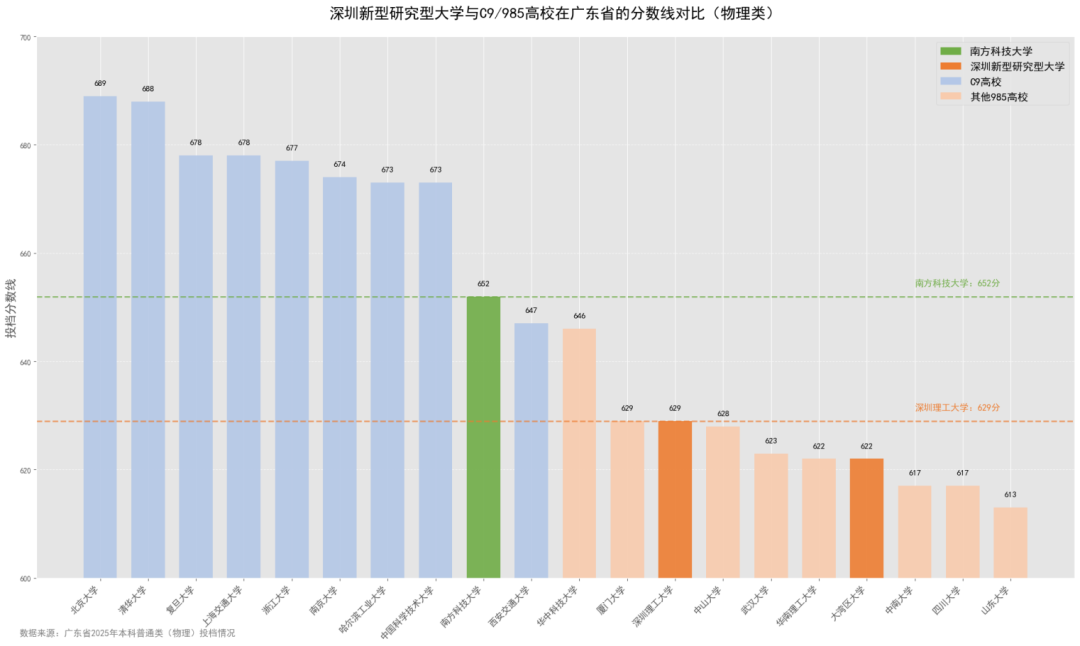 深圳新型研究型大學與C9/985高校在廣東省2025年本科普通類(物理)分數線對比圖