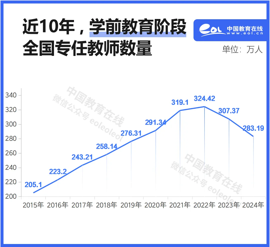 十年來,我國學前教育專任教師總數總體上升,但近兩年起,教師數量下降趨勢顯現。相較2015年的205.10萬,2024年學前教育教師數量增加近80萬人。