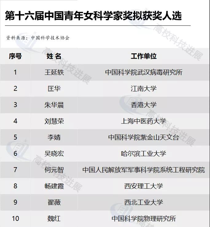 公示名單顯示,江南大學、香港大學、上海中醫藥大學、哈爾濱工業大學、西安理工大學、西北工業大學等6所高校,各有1位女科學家入圍第十六屆“中國青年女科學家獎”擬獲獎人選,她們分別是匡華教授、朱華晨教授、劉慧榮研究員、吳曉宏教授、暢建霞教授、翟薇教授。擬獲獎人選中,有多位女科學家曾獲得“教育部新世紀優秀人才支持計劃”或“ 國家自然科學基金委杰出青年基金”的支持。