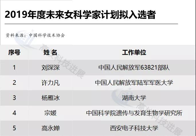 2019年度“未來女科學家計劃”擬入選者名單中,中國人民解放軍陸軍軍醫大學、湖南大學、西安電子科技大學各有1人入選,他們分別是許力凡、楊雁冰、高永嬋。
