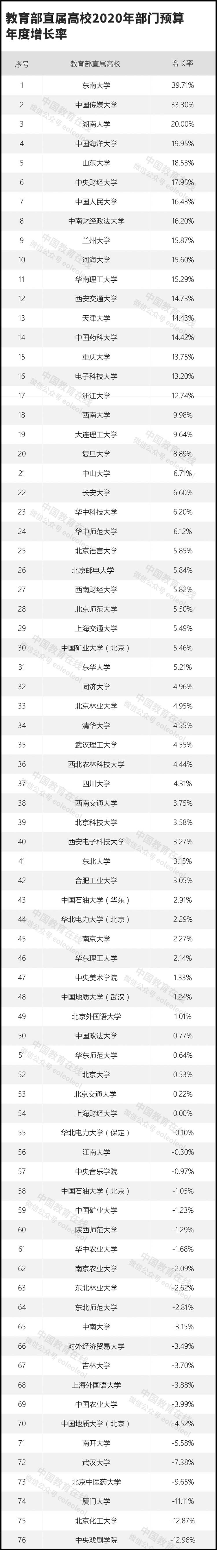 而增長率較高的學校為東南大學、中國傳媒大學、湖南大學。這些高校預算經費增長率都超過20%。14所高校增長率在10-20%之間。另外,有36所高校經費有所增長,但增長率在10%以下。