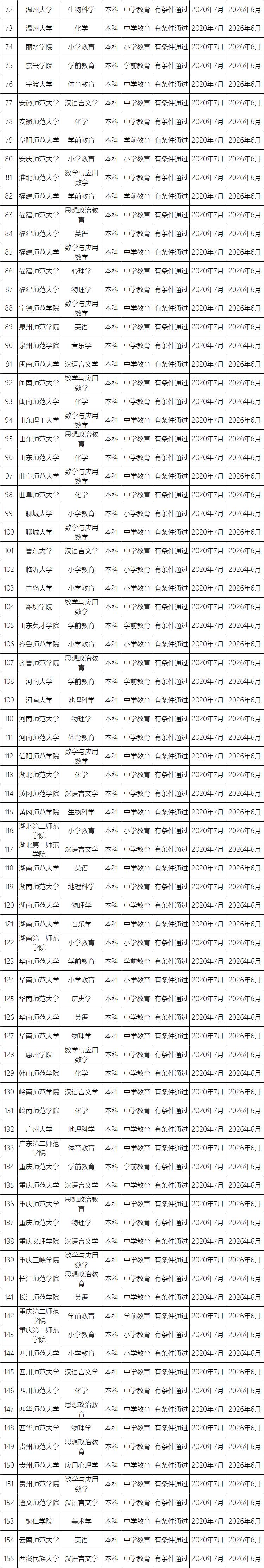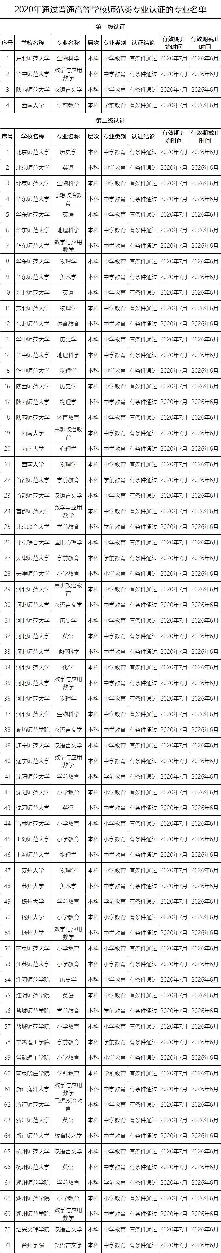 根據《中共中央 國務院關于全面深化新時代教師隊伍建設改革的意見》的決策部署,按照《教育部關于印發〈普通高等學校師范類專業認證實施辦法(暫行)〉的通知》(教師〔2017〕13號),經高校申請、教育評估機構組織專家現場考查、普通高等學校師范類專業認證專家委員會審定,東北師范大學生物科學專業等4個專業通過第三級專業認證,北京師范大學歷史學專業等155個專業通過第二級專業認證。認證結論有效期六年,自2020年7月起至2026年6月止。現將通過認證的專業名單予以公布,并就有關事項通知如下。