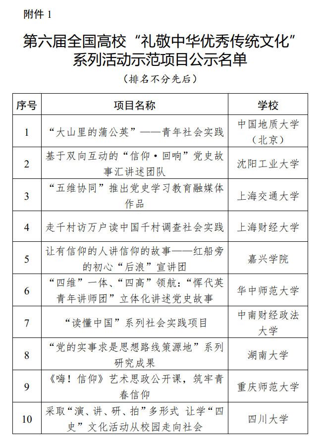 根據《教育部辦公廳關于開展第六屆全國高校“禮敬中華優秀傳統文化”系列活動的通知》(教思政廳函〔2021〕5號)要求,經高校自主申報、專家審核推薦等環節,產生示范項目10項、特色展示項目30項。公示期為2022年9月26日至10月2日。