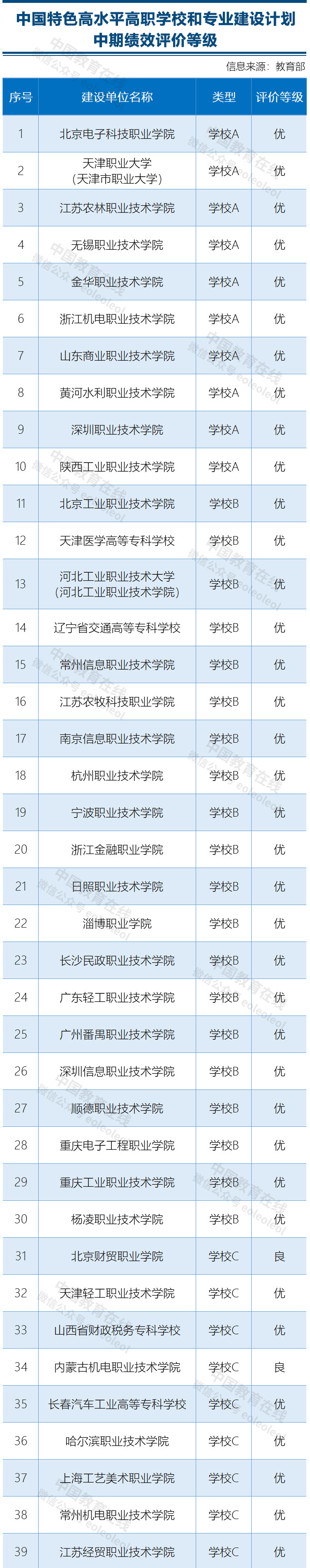 近日,教育部網站公布了中國特色高水平高職學校和專業建設計劃中期績效評價結果。根據《教育部辦公廳 財政部辦公廳關于開展中國特色高水平高職學校和專業建設計劃中期績效評價工作的通知》(教職成廳函〔2022〕10號)要求,經綜合評議、審核公示,對中國特色高水平高職學校和專業建設計劃(簡稱“雙高計劃”)中期績效評價結果予以公布。