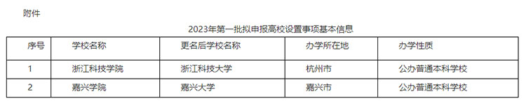 2月27日,浙江省教育廳發布《關于2023年第一批擬申報高校設置事項的公示》,浙江科技學院擬更名浙江科技大學、嘉興學院擬更名嘉興大學。