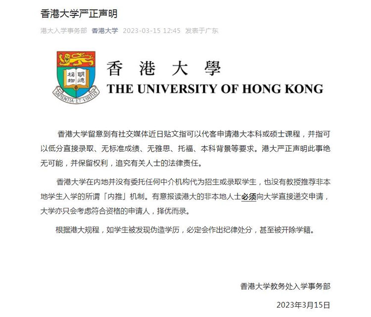 中新網3月15日電 據香港大學微信公眾號消息,15日,香港大學教務處入學事務部發布聲明指,香港大學留意到有社交媒體近日貼文指可以代客申請港大本科或碩士課程,并指可以低分直接錄取、無標準成績、無雅思、托福、本科背景等要求。港大嚴正聲明此事絕無可能,并保留權利,追究有關人士的法律責任。
