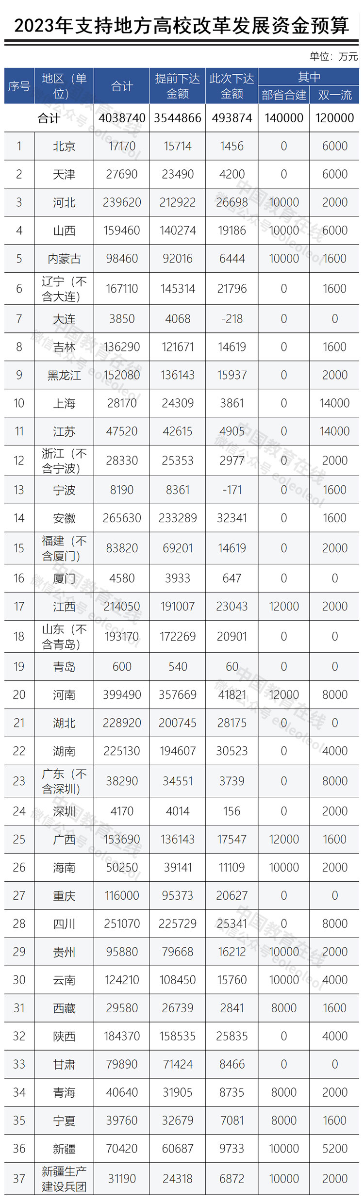 近日,財政部印發《關于下達2023年支持地方高校改革發展資金預算的通知》。為支持地方高校改革發展,本次向各省(自治區、直轄市、計劃單列市)下達資金預算合計49.4億元,加上此前已提前下達金額,目前已累計下達403.9億元。