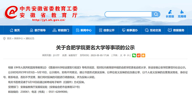 5日,安徽省教育廳網站發布《關于合肥學院更名大學等事項的公示》,根據有關規定,對擬向教育部申報的合肥學院更名合肥大學、新設安徽公安學院事項向社會公示。