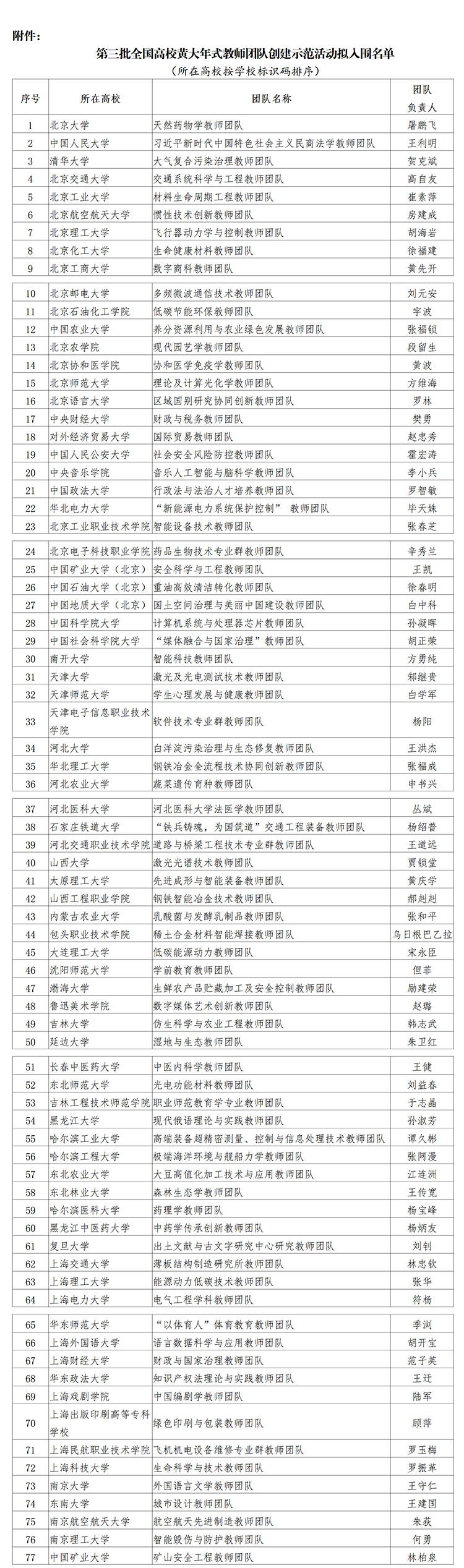 為學習貫徹黨的二十大精神,貫徹落實習近平總書記對黃大年同志先進事跡的重要指示和給全國高校黃大年式教師團隊代表的重要回信精神,以教師團隊建設引導廣大教師持續向黃大年同志學習,根據《教育部關于開展全國高校黃大年式教師團隊創建活動的通知》(教師函〔2023〕2號),在部委院校申報、省級教育行政部門遴選推薦、專家評審基礎上,擬確定第三批“全國高校黃大年式教師團隊”,現進行公示。