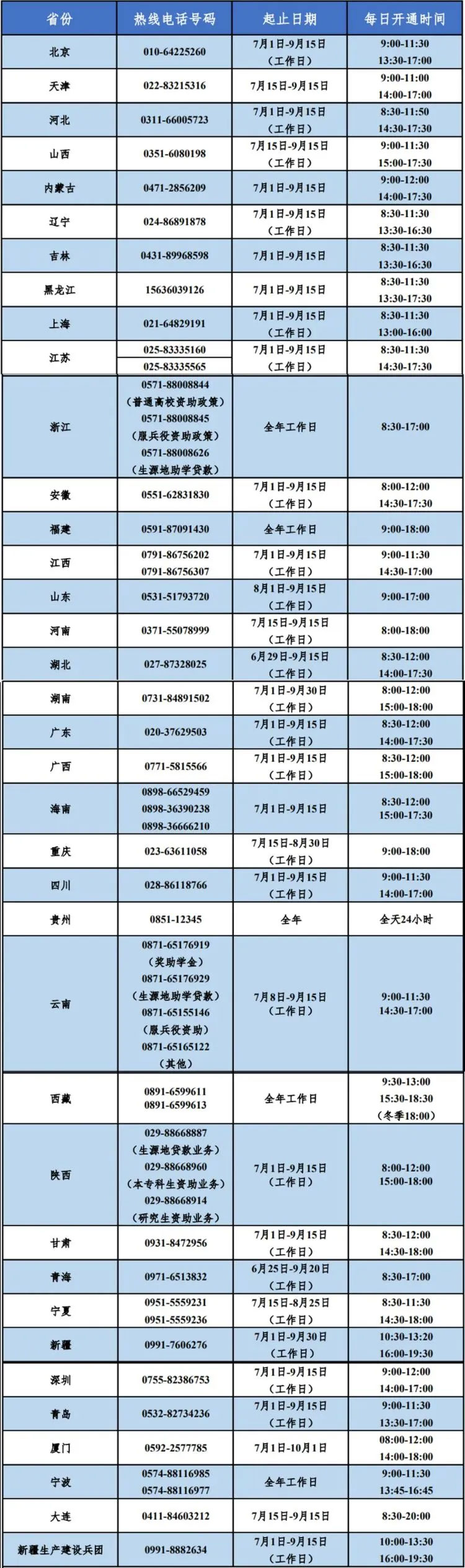 同時,各省(自治區、直轄市)和中央高校同步開通熱線電話,電話號碼與每日開通時間如下。