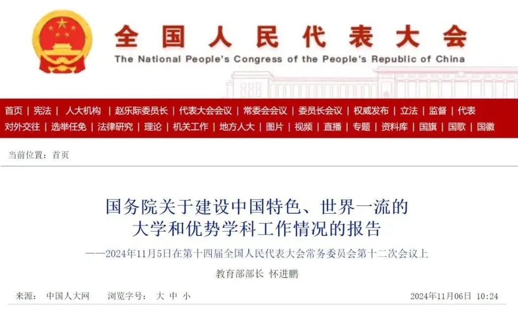 我受國務院委托,向全國人大常委會報告建設中國特色、世界一流的大學和優勢學科工作情況,請審議。