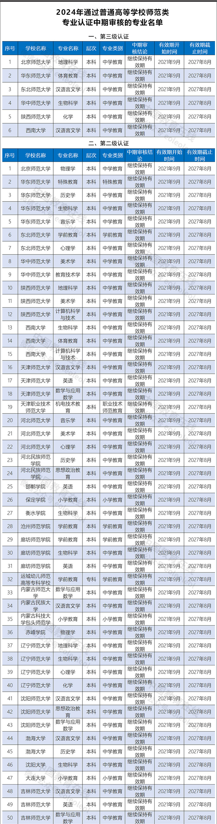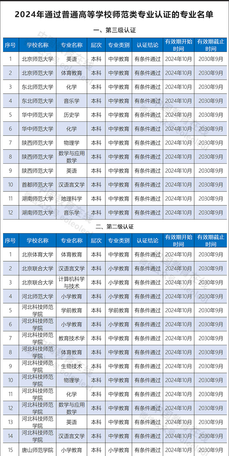 近日,教育部發布《教育部辦公廳關于公布2024年通過普通高等學校師范類專業認證專業名單及中期審核專業名單的通知》,經高校申請、教育評估機構組織專家考查、普通高等學校師范類專業認證專家委員會審定,北京師范大學英語專業等12個專業通過第三級專業認證,北京體育大學體育教育專業等613個專業通過第二級專業認證,認證結論有效期六年,自2024年10月起至2030年9月止。