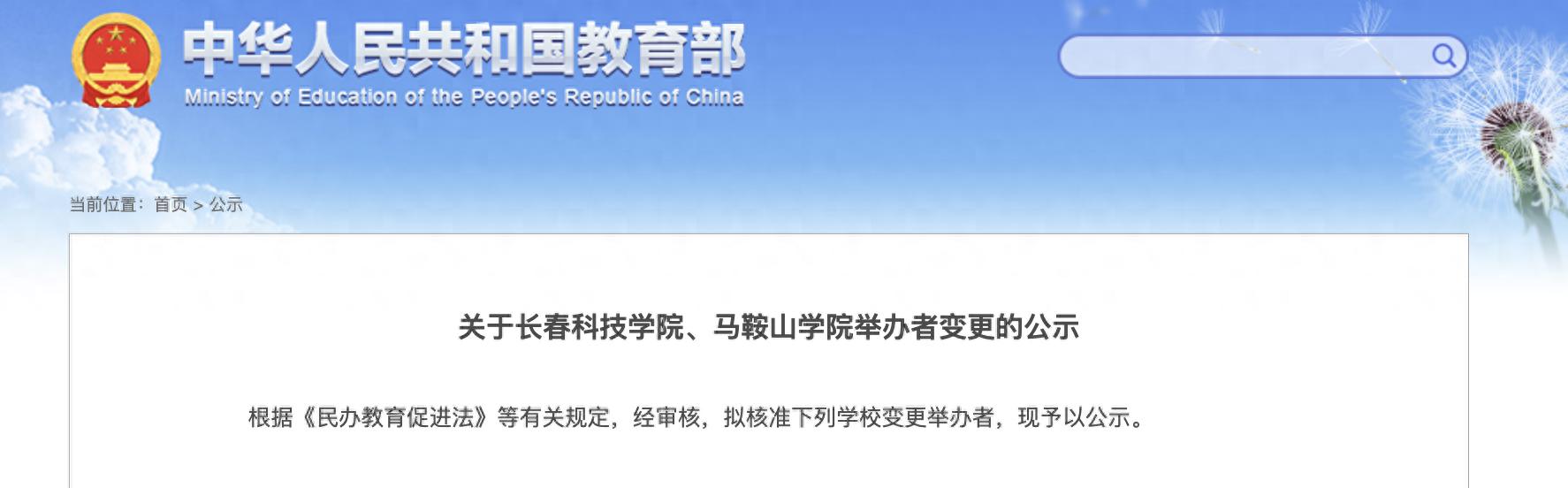12月2日,教育部網站發布《關于長春科技學院、馬鞍山學院舉辦者變更的公示》。