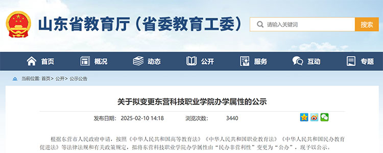 2月10日,山東省教育廳網站發布《關于擬變更東營科技職業學院辦學屬性的公示》,擬將東營科技職業學院辦學屬性由“民辦非營利性”變更為“公辦”。