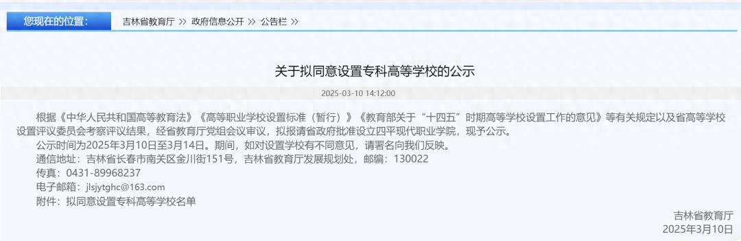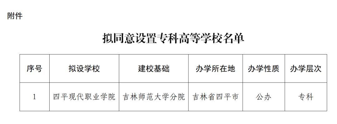 日前,吉林省教育廳發布《關于擬同意設置專科高等學校的公示》:經省教育廳黨組會議審議,擬報請省政府批準設立四平現代職業學院。