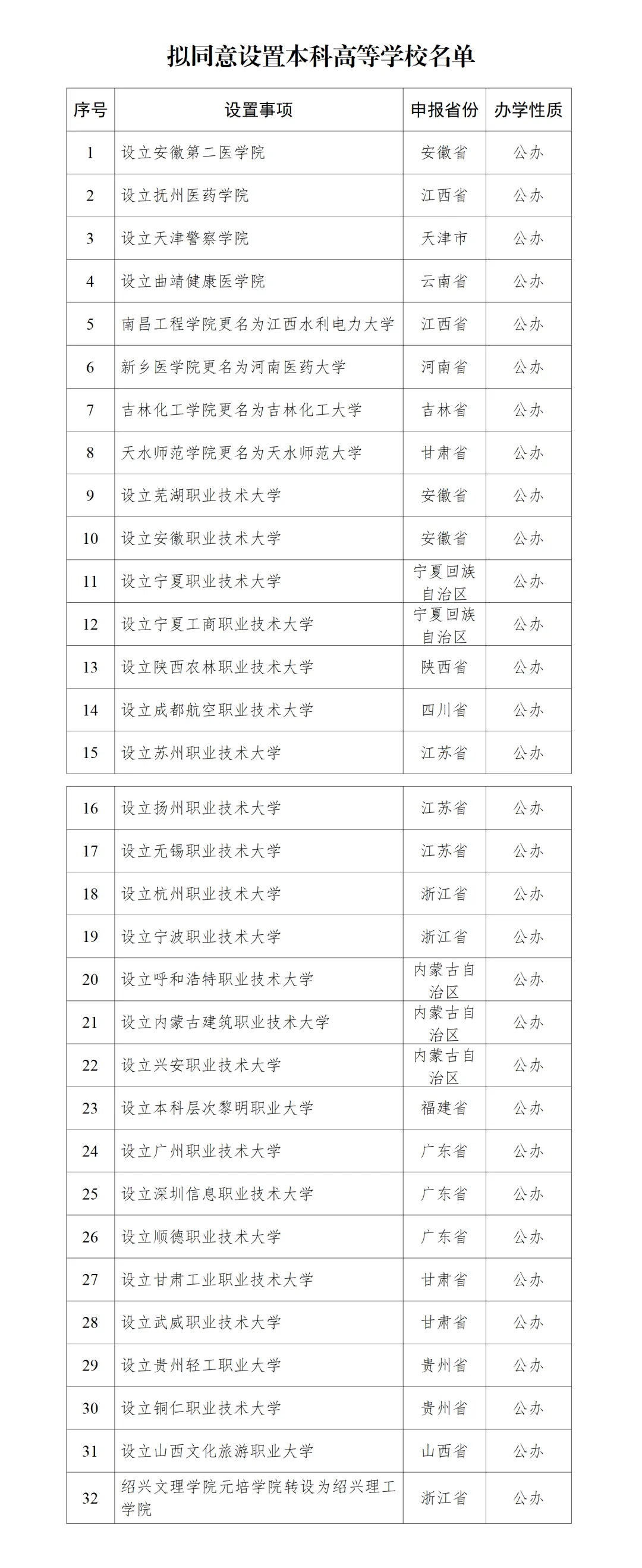 根據《中華人民共和國高等教育法》《普通高等學校設置暫行條例》《普通本科學校設置暫行規定》《本科層次職業學校設置標準(試行)》等有關規定以及第八屆全國高等學校設置評議委員會考察評議結果,經教育部黨組會議審議,擬同意設置安徽第二醫學院等32所學校,現予公示。
