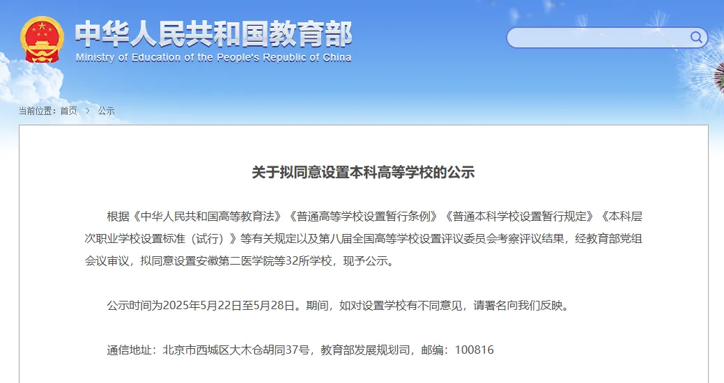 5月22日,教育部發布“關于擬同意設置本科高等學校的公示”。
