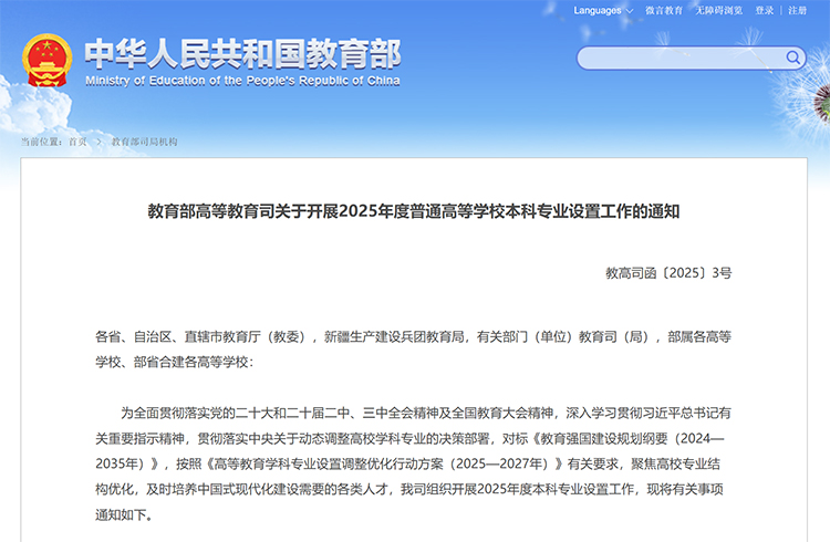 近日,教育部印發《關于開展2025年度普通高等學校本科專業設置工作的通知》。提出,要以國家戰略、市場需求和科技發展為牽引優化專業設置。把優化專業設置作為高等教育改革重點,科學調整專業設置和人才培養模式,深化新工科、新醫科、新農科、新文科建設,推動課程體系與教學內容重塑,對現有專業升級改造,培育交叉融合的新興專業,打造特色優勢專業集群,不斷提高高等教育與經濟社會發展需求的契合度,為中國式現代化建設提供有力支撐。