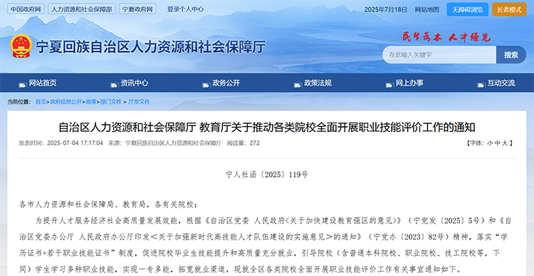 為提升人才服務經濟社會高質量發展效能,根據《自治區黨委 人民政府<關于加快建設教育強區的意見>》(寧黨發〔2025〕5號)和《自治區黨委辦公廳 人民政府辦公廳印發<關于加強新時代高技能人才隊伍建設的實施意見>的通知》(寧黨辦〔2023〕82號)精神,落實“學歷證書+若干職業技能證書”制度,促進院校畢業生技能提升和高質量充分就業,引導院校(含普通本科院校、職業院校、技工院校等,下同)學生學習多種職業技能,實現一專多能,拓寬就業渠道,現就全區各類院校全面開展職業技能評價工作有關事宜通知如下。
